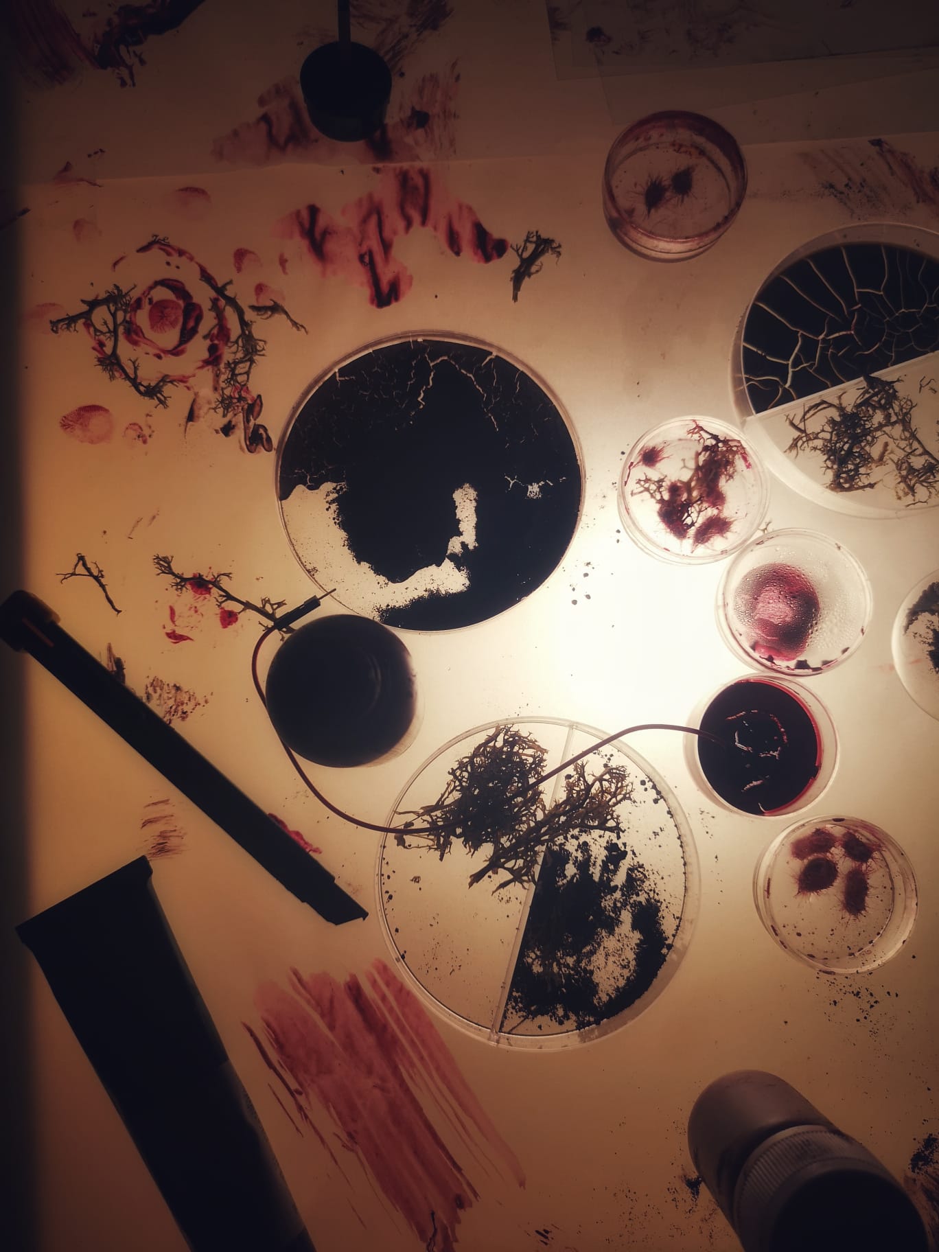 Generarea de imprimeuri ce au ca puncte de plecare imagini, detalii, fragmente, scanări este realizată cu manipulări în Photoshop și Illustrator. Colajele sunt imprimate digital
